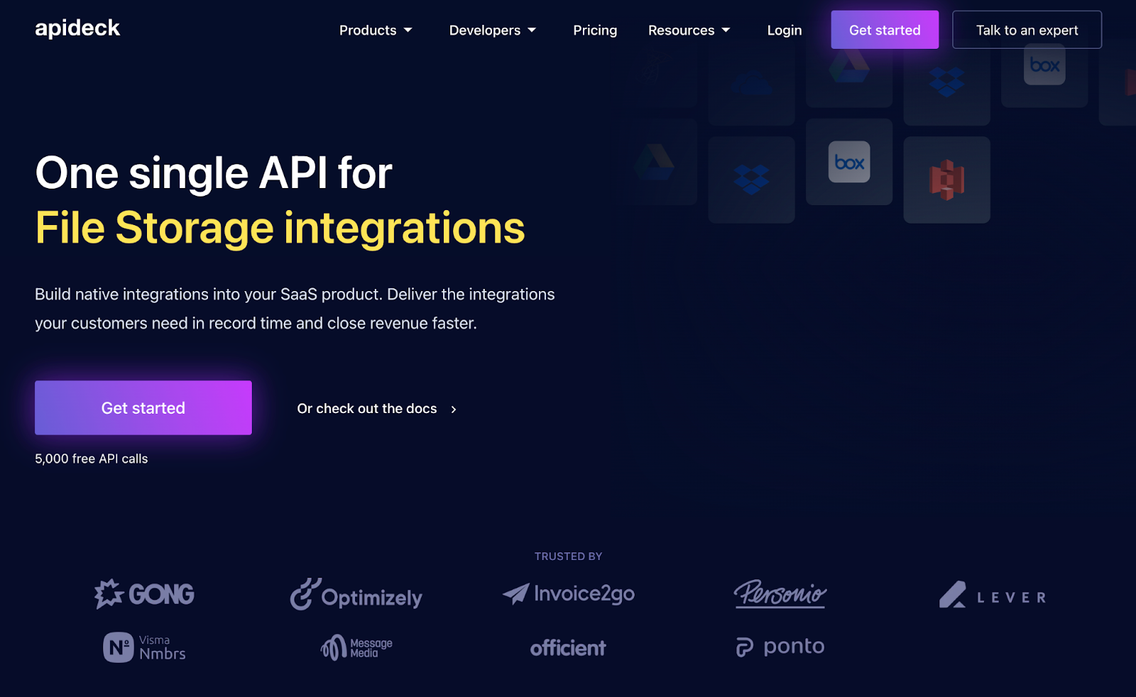 Apideck is another unified API vendor that offers integrations across a large number of API categories. However, instead of enriching their categories with multiple APIs, they choose to cover a wide range of categories. At the time of writing, each of these categories only have 2-5 APIs in them.