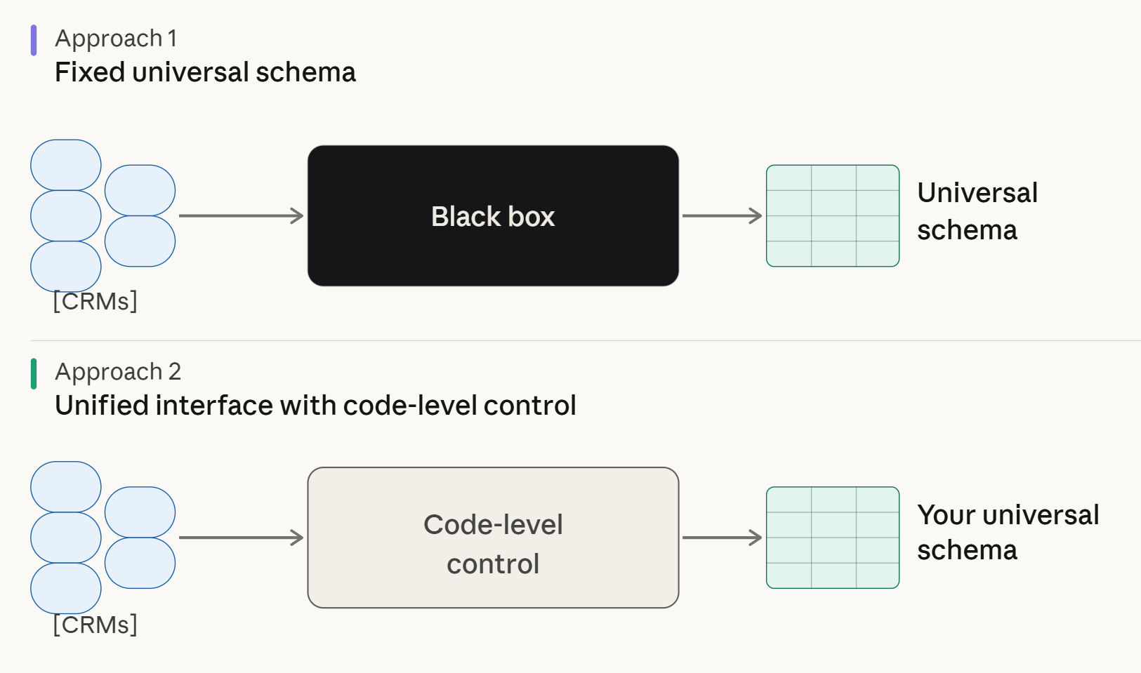 The definitions and implementations of "Unified APIs" differ between providers. The first, used by platforms like Nango, provides a unified interface for API auth, data syncs, tool calls, and webhooks, while letting you write custom integration code per CRM/ERP system. You control the data model and sync logic. You can either consume each API's data as-is or implement your own logic to combine multiple API sources and consume the combined data.
