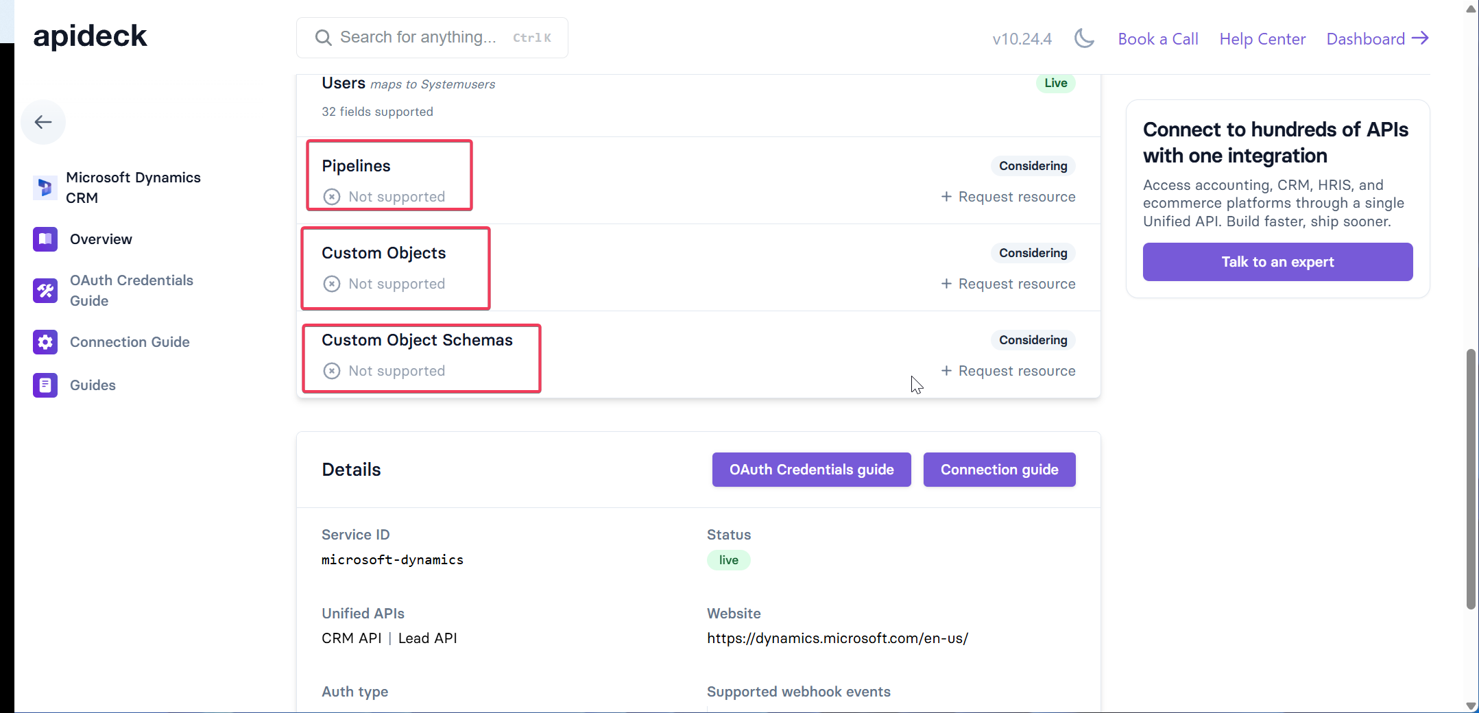 - Limited custom object support: Varies by connector. Salesforce has custom object schemas, but Microsoft Dynamics custom objects are listed as "not supported" in their connector roadmap.