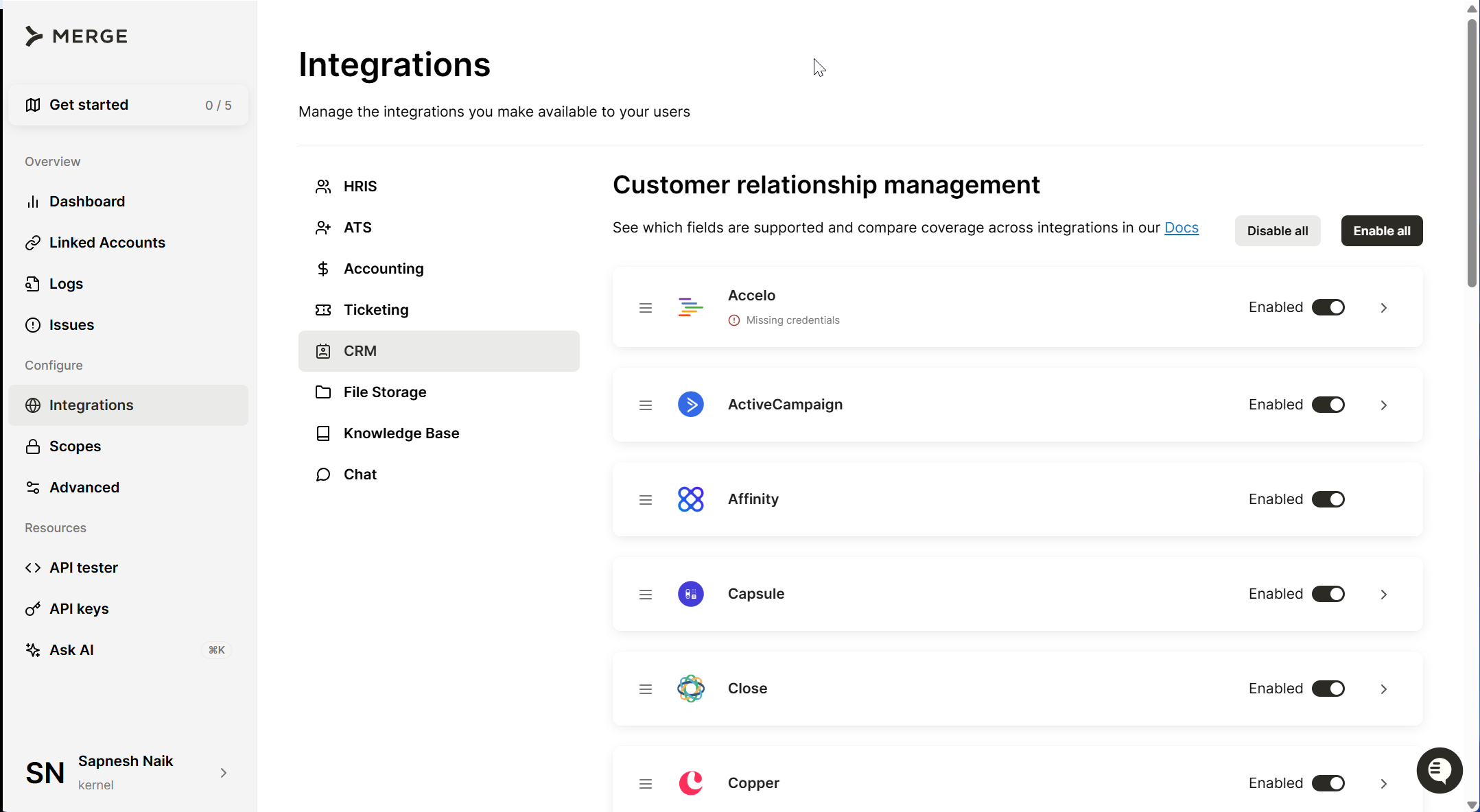- Broad category coverage: Beyond CRM, Merge covers accounting, HRIS, ATS, ticketing, and file storage. Useful if you need integrations across multiple categories.