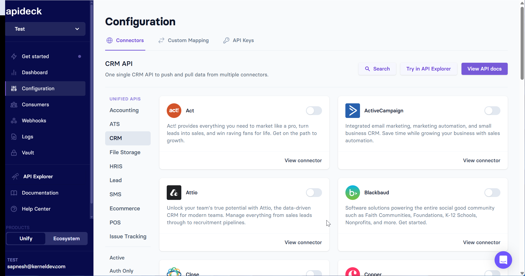 - CRM API with normalized schema: Apideck's CRM API supports Salesforce, HubSpot, Pipedrive, Zoho, and others through a single interface.