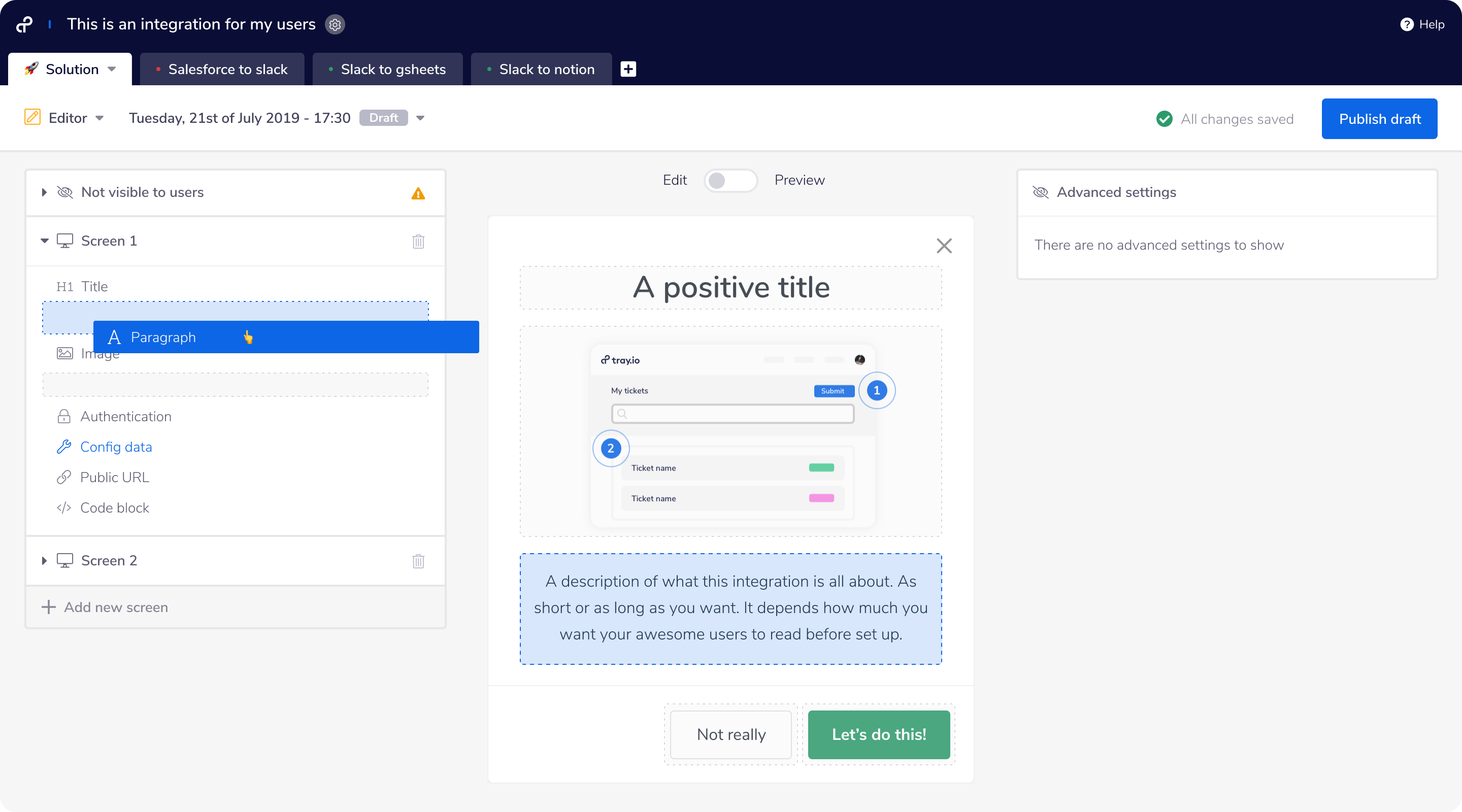 - UI builder: Some teams like Tray’s built-in, low-code UI builder to create custom connection flows for integrations