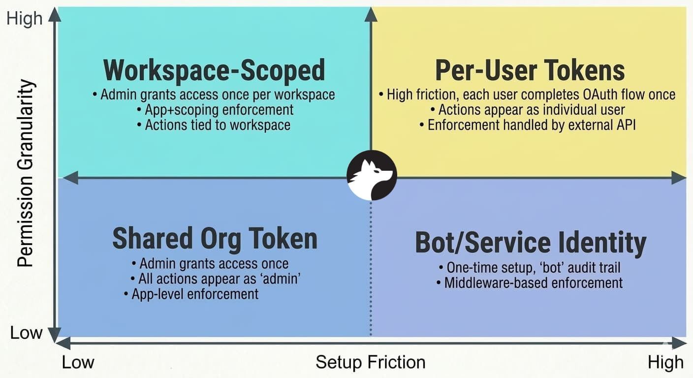 | Bot/Service Identity | Per-User Tokens | Shared Org Token | Workspace-Scoped | |