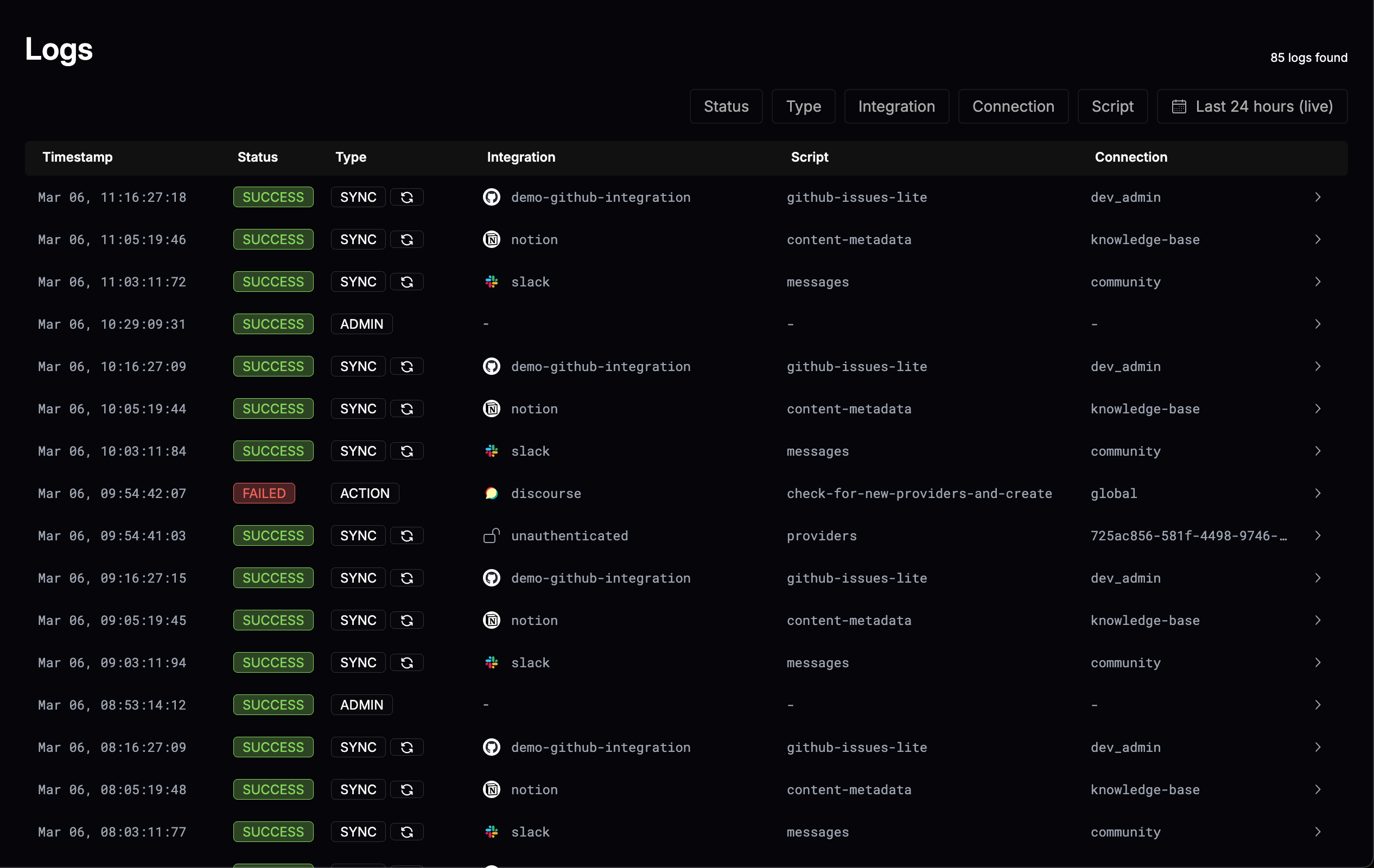 Nango’s logs now cover 18 different log types, updating in real-time. Logs can be filtered by: